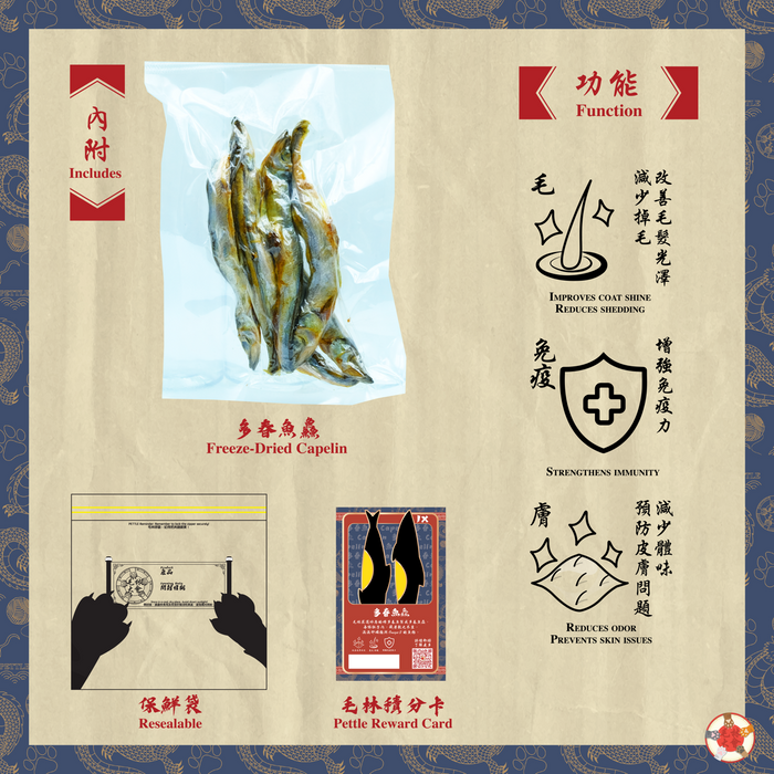 毛林大會傾力呈獻【多春魚鱻】,專為毛林盟主打造,精選冰島雌多春魚!每條魚富含Omega-3、蛋白質、EPA、DHA,滿載魚籽的肚子蘊藏卵磷脂,猶如營養寶藏。「吃一條魚,等於吸收多條鱻」,為盟主提供全方位呵護,兼顧健康與潔齒樂趣,讓盟主在毛林間活力綻放!