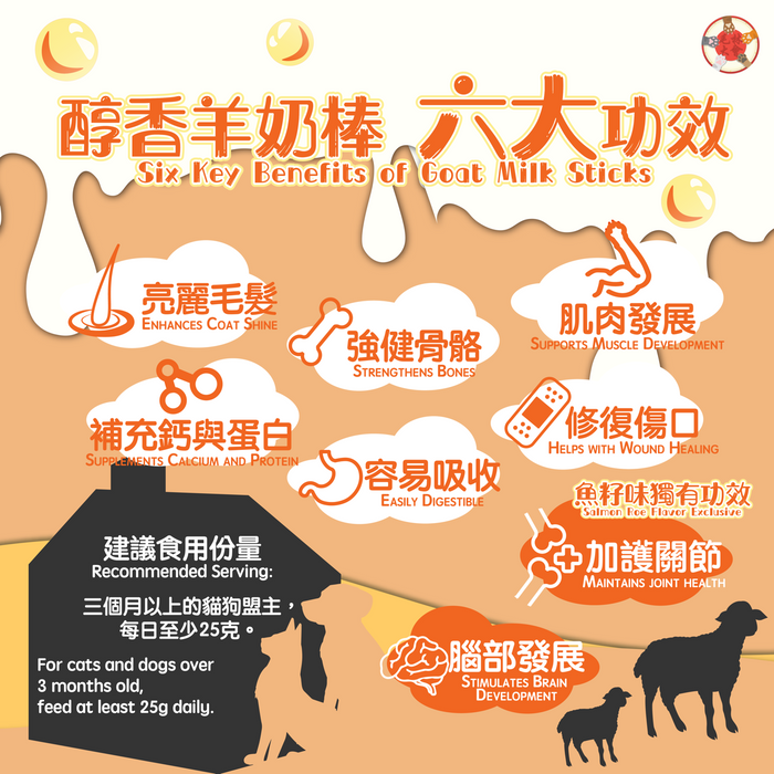 【醇香羊奶棒 (魚籽味)】適合一眾乳糖不耐症盟主、成長期貓狗,具磨牙潔齒與關節護理功效。一盒在手,補鈣護健康,伴盟主在毛林間快樂長,成為每日健康之選!