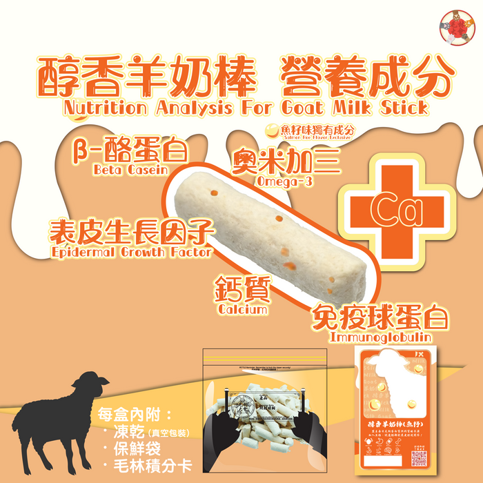 毛林大會熱情推出【醇香羊奶棒 (魚籽味)】,是毛林盟主的每日營養神器!以55%純淨羊奶、35%泰國無激素雞胸肉與10%三文魚籽精心調配,製成香濃棒狀凍乾,活潑風味讓盟主愛不釋口!富含β- 酪蛋白、鈣質、表皮生長因子與免疫球蛋白與Omega-3,使用羊奶製作,特別為乳糖不耐症與成長期盟主設計,腸道易吸收,每日食用促進健康成長。